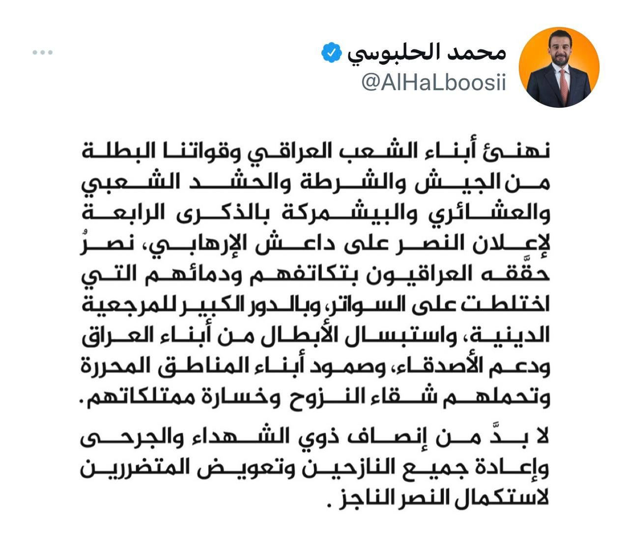 وقال الحلبوسي في تغريدة عبر تويتر اطلعت عليها”الرشيد”، انه”لابد من انصاف ذوي الشهداء والجرحى واعادة جميع النازحين وتعويض المتضررين لاستكمال النصر الناجز”.