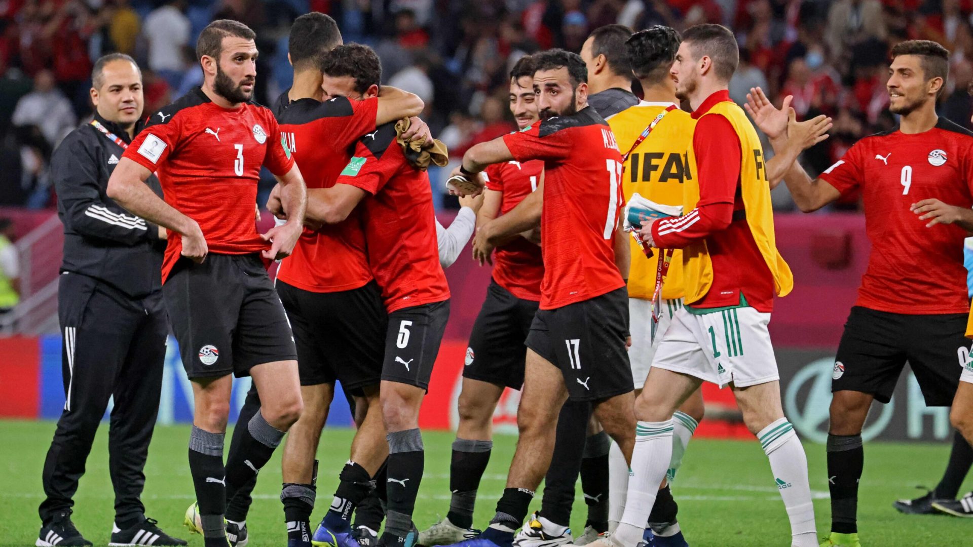 Egypt's players celebrate their qualification after the FIFA Arab Cup 2021 group D football match between Algeria and Egypt at the Al-Janoub Stadium in the Qatari city of Al-Wakrah on December 7, 2021. (Photo by KARIM SAHIB / AFP)