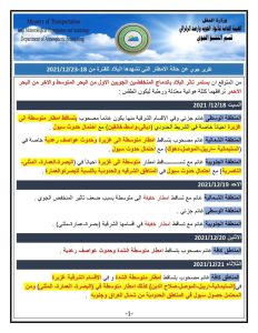 اصدرت وزارة النقل/ الهيئة العامة للانواء الجوية والرصد الزلزالي قسم التنبؤ الجوي ، السبت ، التقرير الجوي الخاص بتأثر البلاد بحالة الإمطار المتوقعة للأيام المقبلة إبتداءً من يوم السبت الموافق 18 كانون الاول 2021 والايام التي اليه .