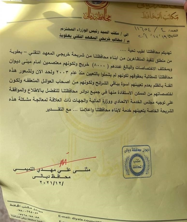 بالوثيقة.. ديالى تخاطب الحكومة لتعيين 8000 من خريجي المعاهد