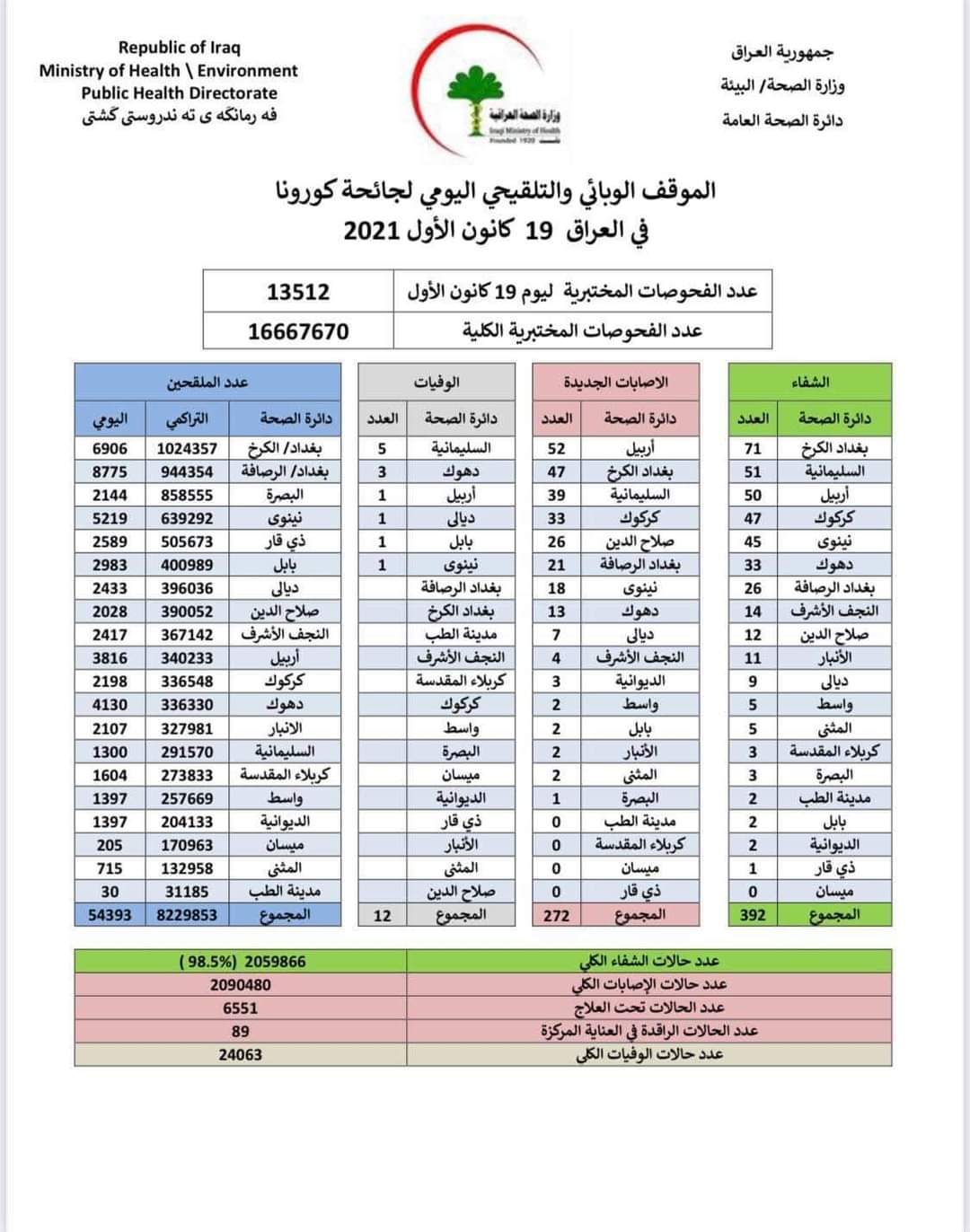 محلياتالصحة تعلن تسجيل 272 اصابة جديدة بفيروس كورونا قبل 4 سنوات 1 مشاهدة شارك اعلنت وزارة الصحة، الموقف الوبائي لفيروس كورونا في عموم العراق. وذكرت الوزارة في بيان تلقته”الرشيد”، انها”سجلت 272 اصابة جديدة و392 حالة شفاء”. واضافت، انه”تم تسجيل 12 حالة وفاة بالفيروس”. الوسومالصحةكوروناقد يهمك أيضا أمن مقتل شاب برصاصة أطلقها منتسب أمني بالخطأ خلال "مشاجرة اعتيادية" في أبي غريب غربي بغداد قبل 3 ساعات 7 مشاهدات رياضة مدرب الأرجنتين معلقاً على قرعة المونديال: منتخب الجزائر قوي والأردن مجهول بالنسبة لي قبل 3 ساعات 14 مشاهدات محليات العراق يستقبل موجة أمطار غزيرة.. الأنواء تحذر من سيول وفيضانات في المناطق غير المخدومة اعتباراً من الغد قبل 3 ساعات 16 مشاهدات محليات المالية تنفي استقبال نائبة للتفاوض مع وزيرتها بشأن مستحقات المقاولين قبل 4 ساعات 10 مشاهدات عربي ودولي البيت الأبيض يحذر: أوروبا مهددة بـ"زوال الحضارة" خلال 20 عاماً قبل 4 ساعات 9 مشاهدات