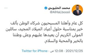 وقال الحلبوسي في تغريدة عبر تويتر اطلعت عليها الرشيد: “كل عام وأهلنا المسيحيون شركاء الوطن بألف خير بمناسبة حلول أعياد الميلاد المجيد، سائلين المولى الكريم أن يعيدها عليهم وعلى وطننا بالخير والمحبة والسلام”.