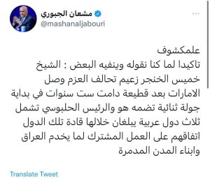 وقال الجبوري في تغريدة عبر تويتر اطلعت عليها الرشيد، انه"تاكيدا لما كنا نقوله وينفيه البعض : الشيخ خميس الخنجر زعيم تحالف العزم وصل الامارات بعد قطيعة دامت ست سنوات في بداية جولة ثنائية تضمه هو والرئيس الحلبوسي تشمل ثلاث دول عربية".