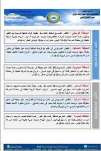 اعلنت هيئة الانواء الجوية، الخميس، حالة طقس العراق خلال الايام المقبلة، فيما اشارت الى تساقط امطار خفيفة ورعدية وارتفاع بدرجات الحرارة.