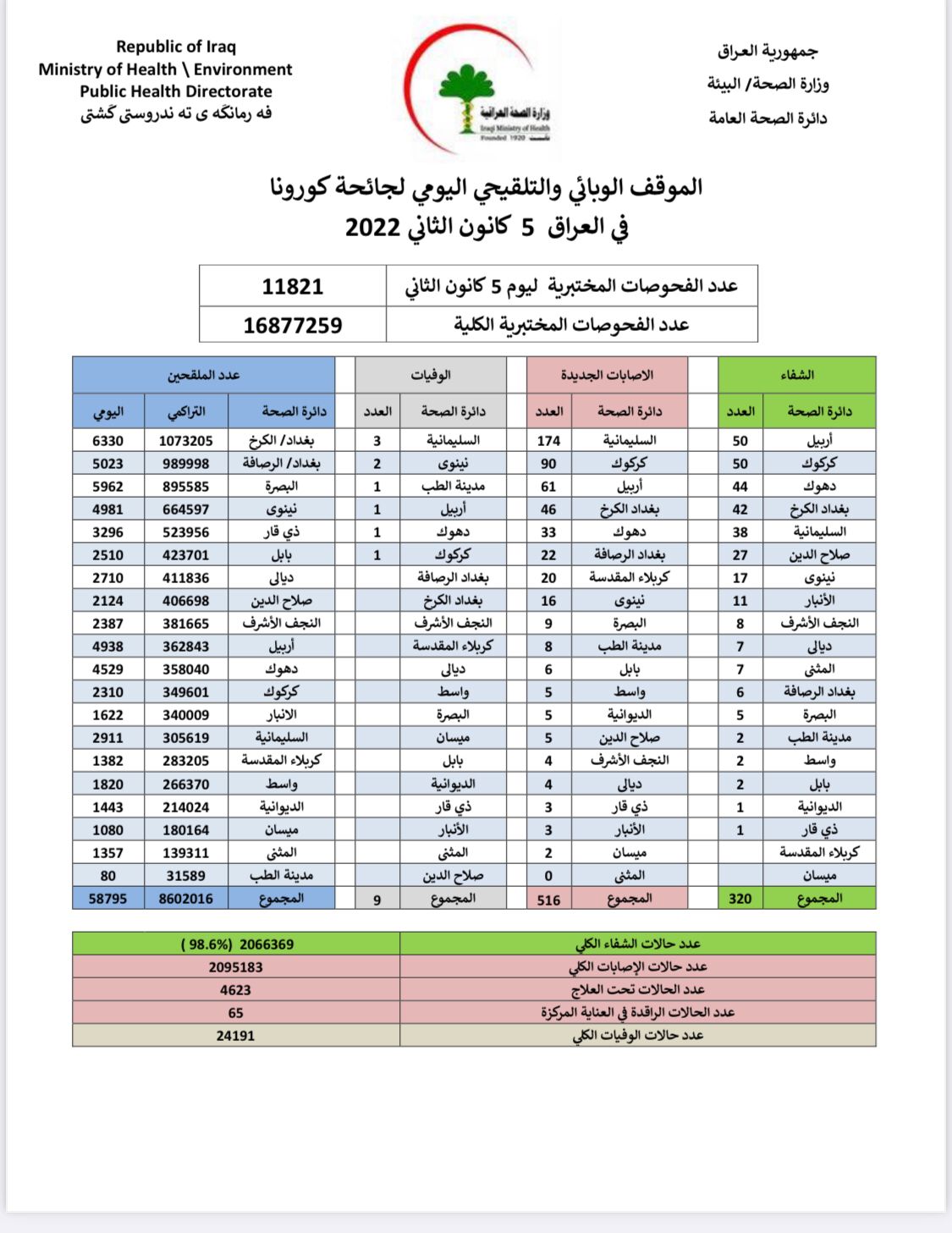 أعلنت وزارة الصحة، اليوم الاربعاء، الموقف الوبائي اليومي لجائحة كورونا في عموم العراق.