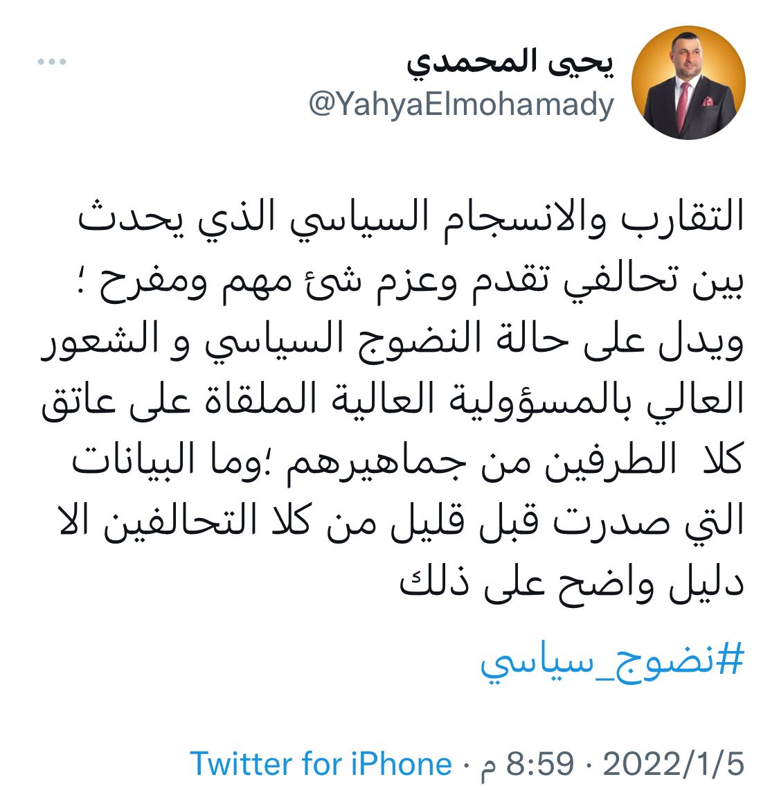 وقال المحمدي، في تغريدة على تويتر تابعتها الرشيد، ان “التقارب والانسجام السياسي الذي يحدث بين تحالفي تقدم وعزم شئ مهم ومفرح؛ ويدل على حالة النضوج السياسي و الشعور العالي بالمسؤولية العالية الملقاة على عاتق كلا الطرفين من جماهيرهم”.