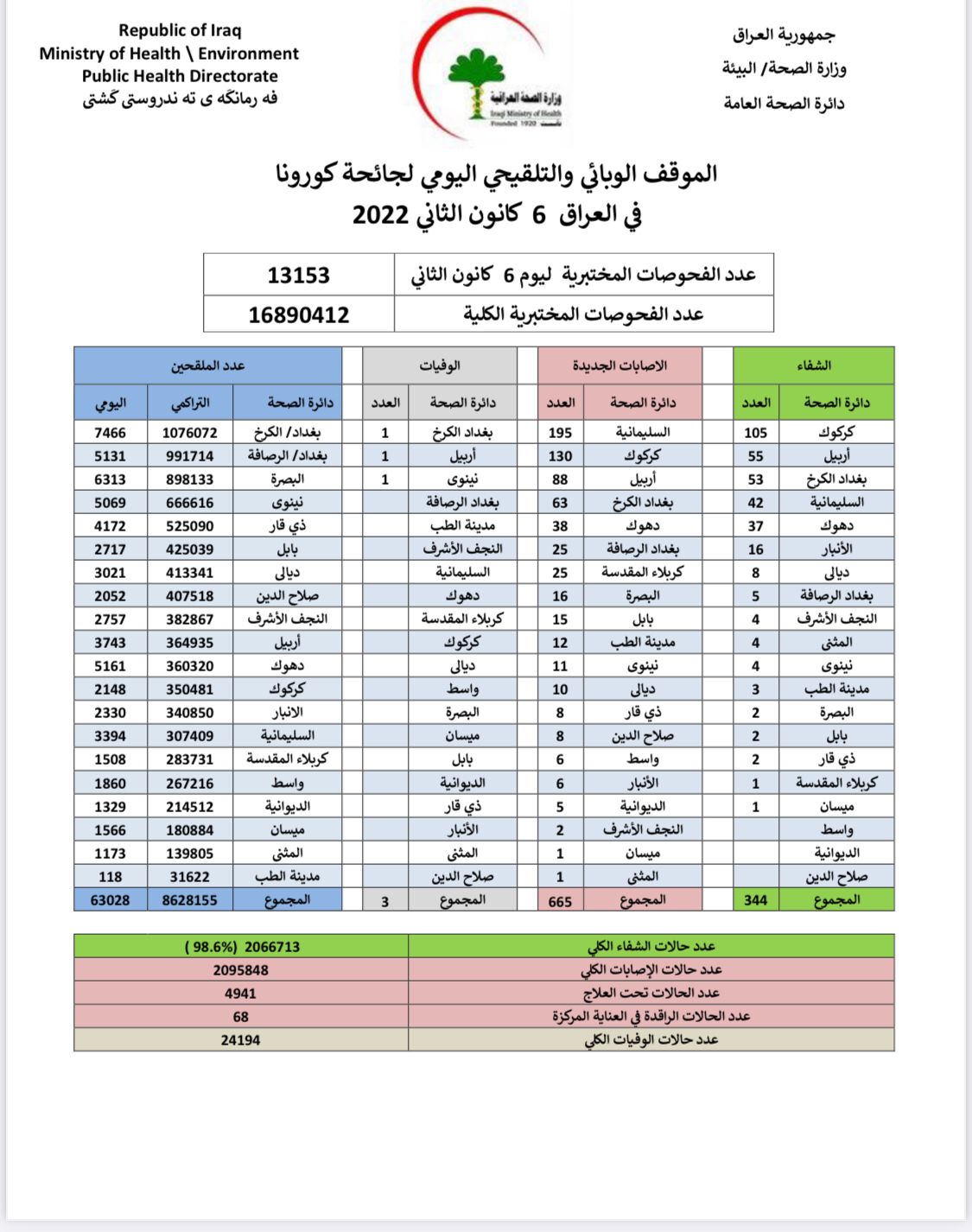 أعلنت وزارة الصحة، اليوم الخميس، الموقف الوبائي اليومي لجائحة كورونا في عموم العراق.