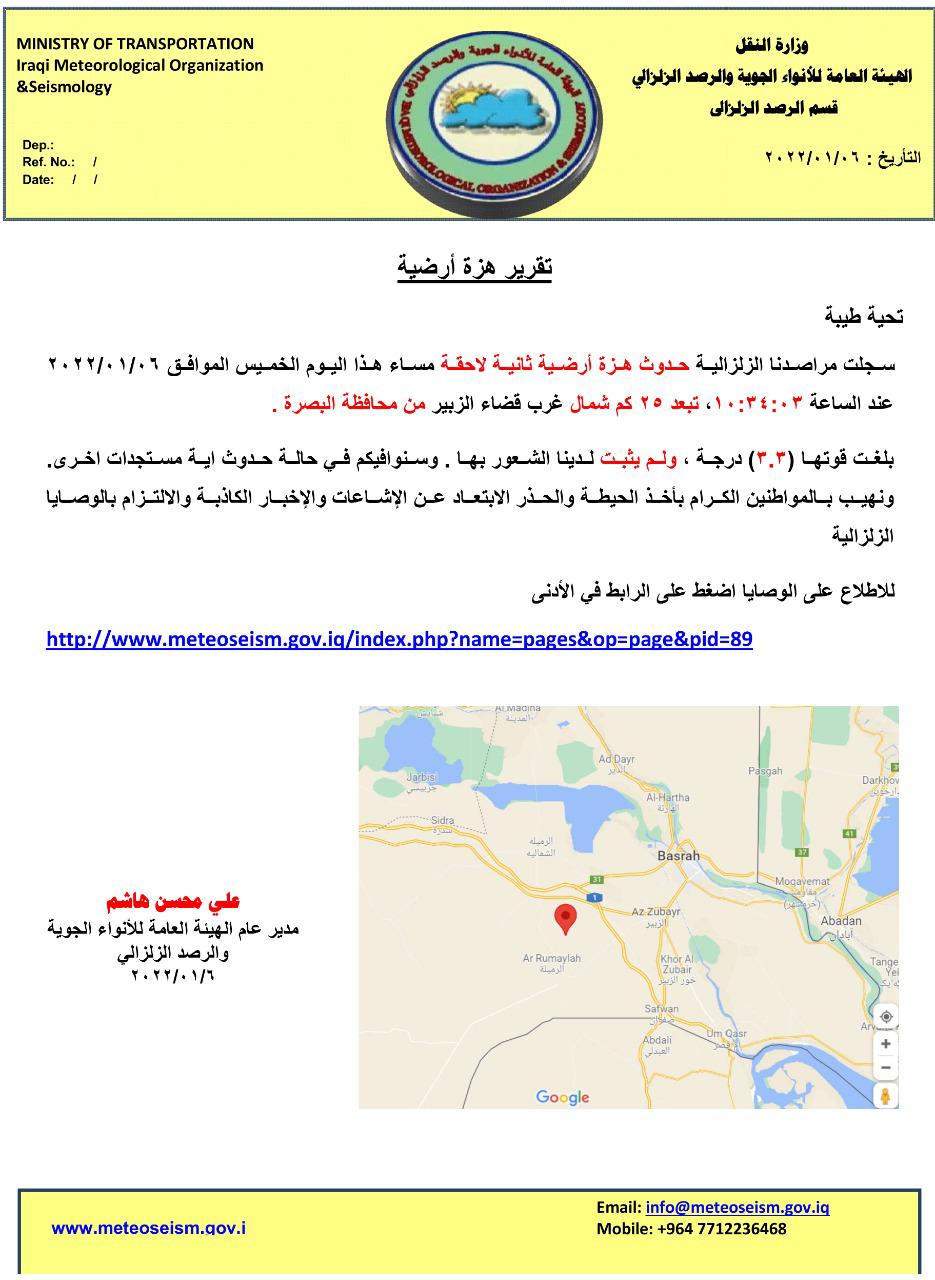 وذكرت الوزارة، في بيان تلقته الرشيد، ان “مراصدها الزلزالية في الهيئة العامة للانواء الجوية والرصد الزلزالي سجلت حدوث هزة أرضية ثانية لاحقة مساء هذا اليوم الموافق 6 كانون الثاني 2022 في قضاء الزبير من محافظة البصرة”.