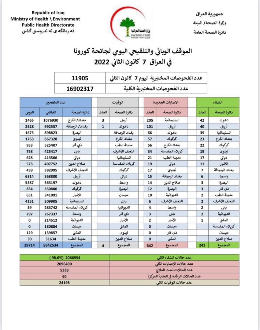 اعلنت وزارة الصحة، الموقف الوبائي لفيروس كورونا في عموم العراق.