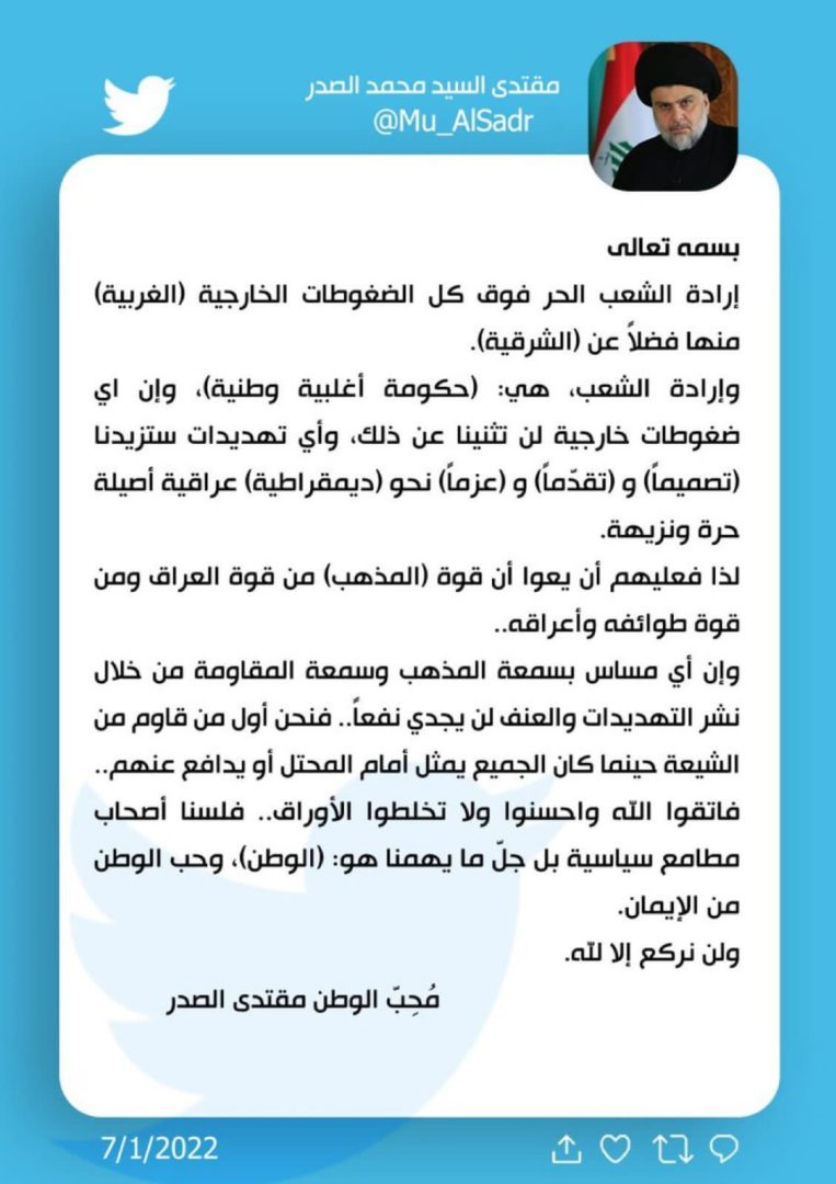 وقال الصدر في تغريدة عبر تويتر اطلعت عليها الرشيد، ان”ارادة الشعب الحر فوق كل الضغوطات الخارجية الغربية منها، فضلا عن الشرقية”.