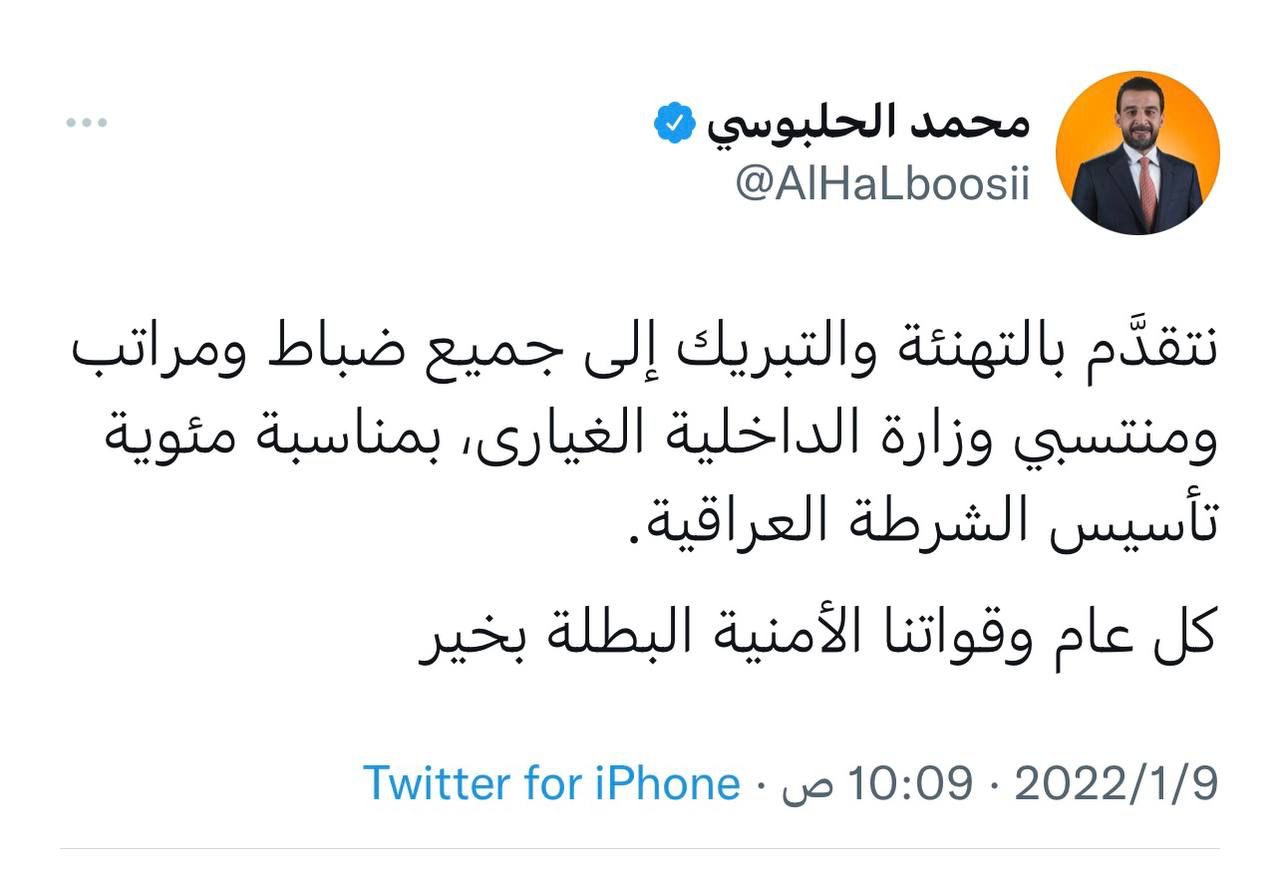 سياسةالحلبوسي يهنئ الشرطة العراقية بالذكرى المئوية لتأسيسها قبل 4 سنوات 6 مشاهدات شارك الوسومالحلبوسيالشرطة العراقيةقد يهمك أيضا رياضة المنتخب الوطني العراقي يفتتح الستجيل في مرمى نظيره السوداني قبل 37 ثانية 1 مشاهدة الثامنة “صليات” فوق رؤوس الإطار و9 مرشحين على باب النجف! قبل 32 دقيقة 4 مشاهدات أمن القبض على منتحل صفة ضابط بمنطقة الزعفرانية جنوب شرقي بغداد قبل 32 دقيقة 5 مشاهدات رياضة انطلاق الشوط الثاني بين العراق والسودان في بطولة كأس العرب قبل 37 دقيقة 16 مشاهدات رياضة انتهاء الشوط الاول بين العراق والسودان في كأس العرب بالتعادل السلبي قبل 51 دقيقة 12 مشاهدات