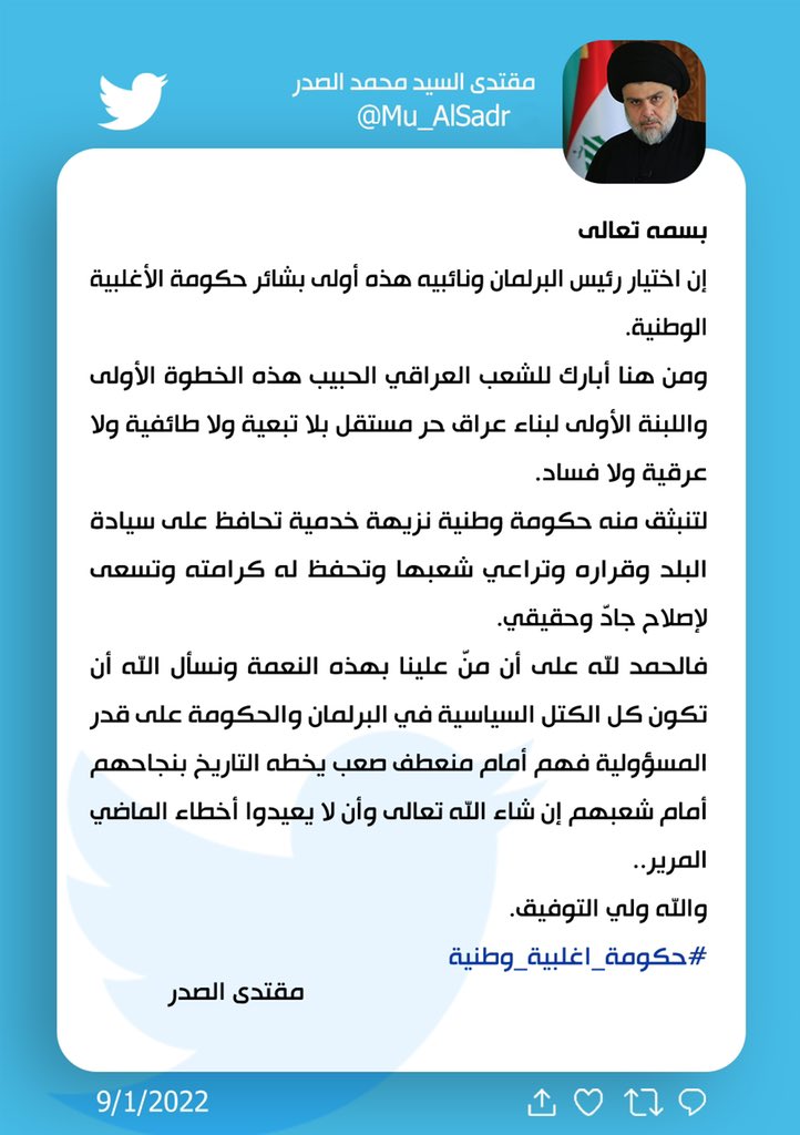 وقال السيد الصدر، في تغريدة على تويتر تابعتها الرشيد، إن “اختيار رئيس البرلمان ونائبيه هذه أولى بشائر حكومة الأغلبية الوطنية، ومن هنا أبارك للشعب العراقي الحبيب هذه الخطوة الأولى واللبنة الأولى لبناء عراق حر مستقل بلا تبعية ولا طائفية ولا عرقية ولا فساد”.