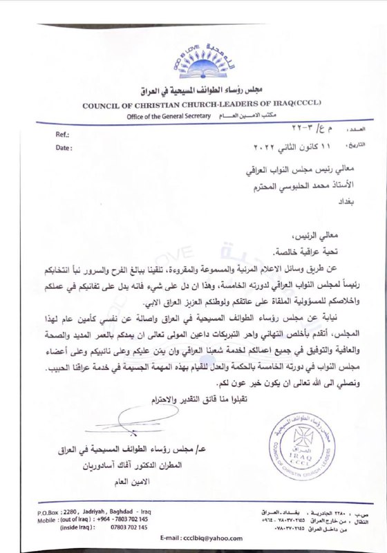 تلقى رئيس مجلس النواب محمد الحلبوسي، برقية تهنئة من رؤساء الطوائف المسيحية في العراق بمناسبة إعادة انتخابه رئيساً لمجلس النواب بدورته الخامسة.