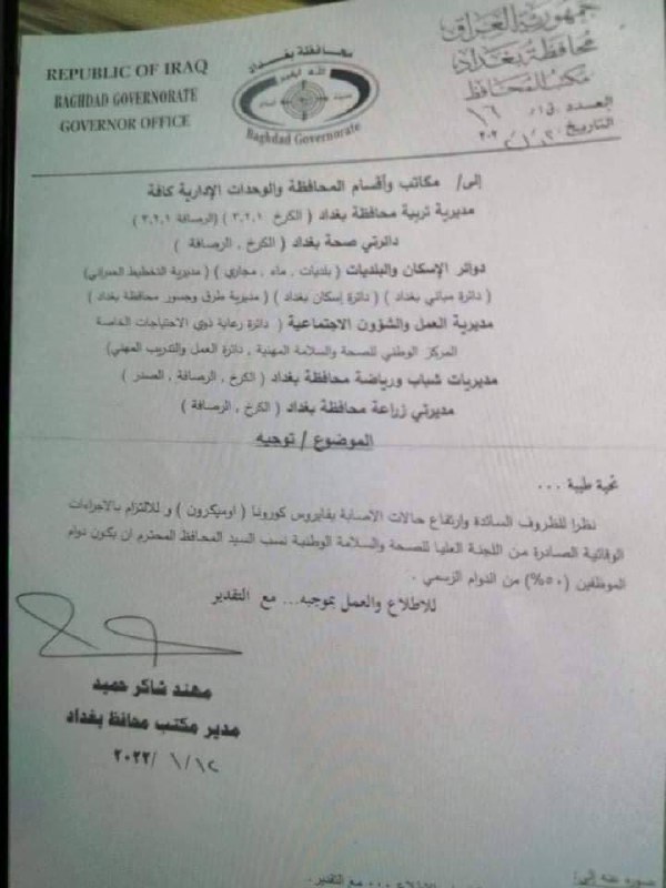 محلياتبالوثيقة .. محافظ بغداد يوجه بأن يكون الدوام 50% بسبب ارتفاع حالات الاصابة بفيروس كورونا قبل 4 سنوات 7 مشاهدات شارك الوسومالدوام 50%قد يهمك أيضا الاخبار العاجلة المبعوث الأممي السابق أخضر الإبراهيمي: الهدف من أفغانستان كان العراق قبل 3 ساعات 16 مشاهدات محليات الأنواء: العراق يتأثر بموجة قطبية تتسبب بانخفاض درجات الحرارة إلى الصفر المئوي أو أدنى خلال الأيام القادمة قبل 4 ساعات 19 مشاهدات محليات العراق يعزي سويسرا بضحايا حادث منتجع كرانس-مونتانا للتزلج قبل 4 ساعات 19 مشاهدات محليات مصرع وإصابة 11 شخصاً بحادثي سير في ديالى والمثنى قبل 4 ساعات 9 مشاهدات أمن مقتل شخص بإطلاق نار وسط مدينة العمارة قبل 4 ساعات 21 مشاهدات