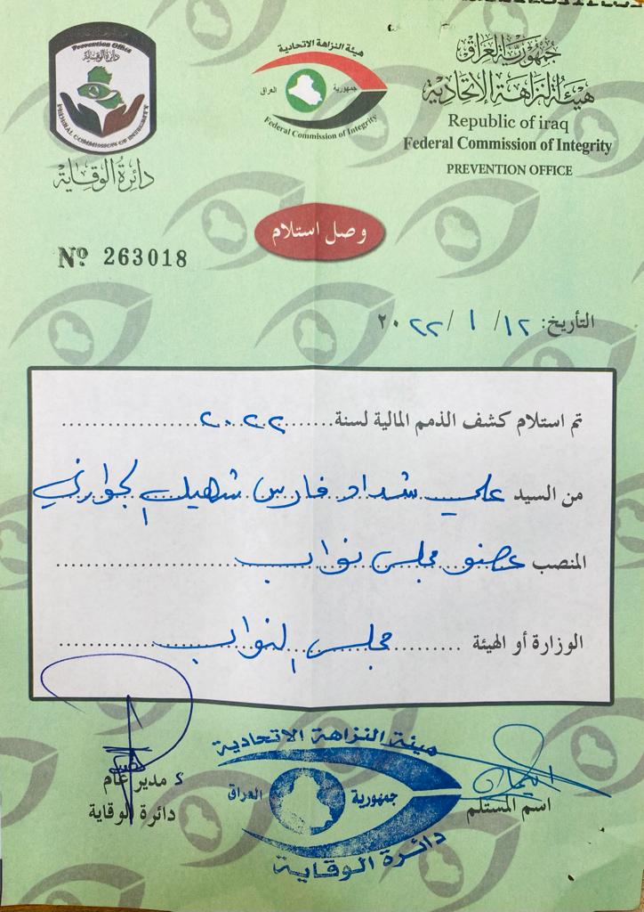 وتسلم الفارس وصل استلام من النزاهة يثبت كشف ذمته المالية.