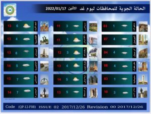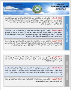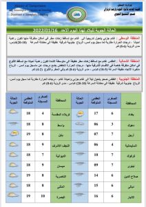 أعلنت هيئة الأنواء الجوية، اليوم الأحد، عن حالة الطقس في البلاد للأسبوع الحالي، فيما توقعت تساقط أمطار مع ارتفاع في درجات الحرارة.