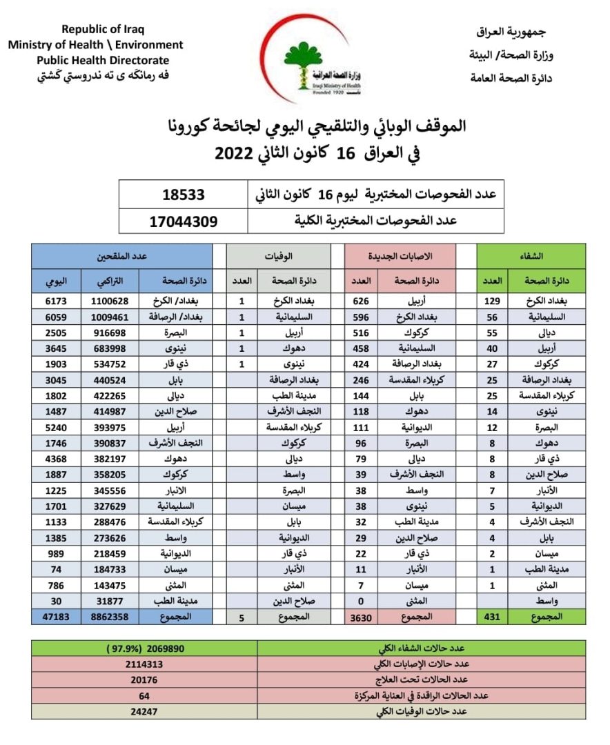 محلياتالصحة تعلن تسجيل 3630 اصابة جديدة بكورونا في عموم العراق قبل 4 سنوات 3 مشاهدات شارك الوسومالصحةقد يهمك أيضا أمن مقتل شاب برصاصة أطلقها منتسب أمني بالخطأ خلال "مشاجرة اعتيادية" في أبي غريب غربي بغداد قبل 4 ساعات 9 مشاهدات رياضة مدرب الأرجنتين معلقاً على قرعة المونديال: منتخب الجزائر قوي والأردن مجهول بالنسبة لي قبل 4 ساعات 18 مشاهدات محليات العراق يستقبل موجة أمطار غزيرة.. الأنواء تحذر من سيول وفيضانات في المناطق غير المخدومة اعتباراً من الغد قبل 5 ساعات 16 مشاهدات محليات المالية تنفي استقبال نائبة للتفاوض مع وزيرتها بشأن مستحقات المقاولين قبل 5 ساعات 10 مشاهدات عربي ودولي البيت الأبيض يحذر: أوروبا مهددة بـ"زوال الحضارة" خلال 20 عاماً قبل 5 ساعات 9 مشاهدات