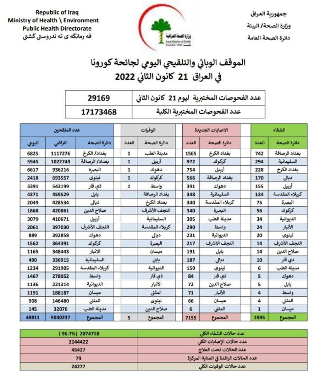 اعلنت وزارة الصحة، الجمعة، الموقف الوبائي لفيروس كورونا في عموم العراق.