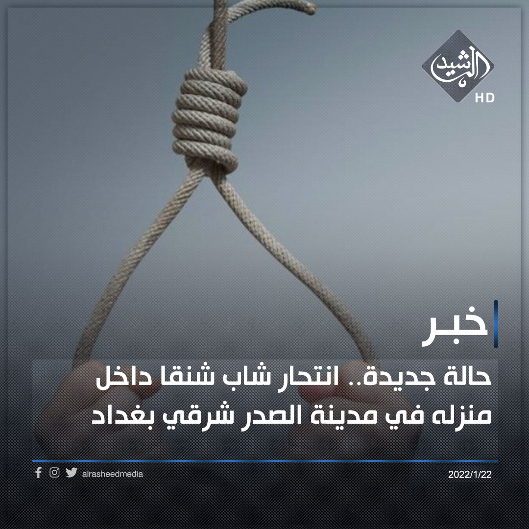 وقال مصدر امني للرشيد، ان”المدعو (س.ع) تولد ٢٠٠٧ اقدم على الانتحار باسلوب شنق نفسه داخل منزله ضمن قطاع ٣٨ في مدينة الصدر شرقي بغداد”.