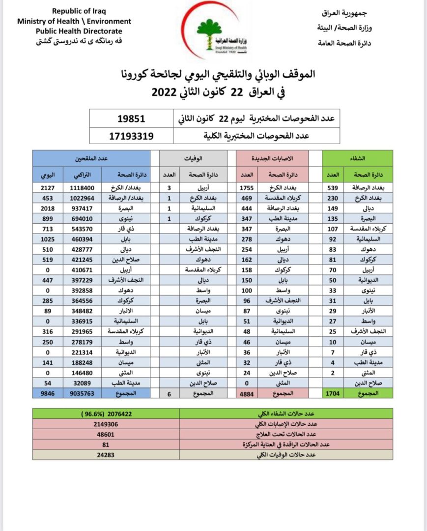 أعلنت وزارة الصحة، اليوم السبت، الموقف الوبائي اليومي لجائحة كورونا في عموم العراق.