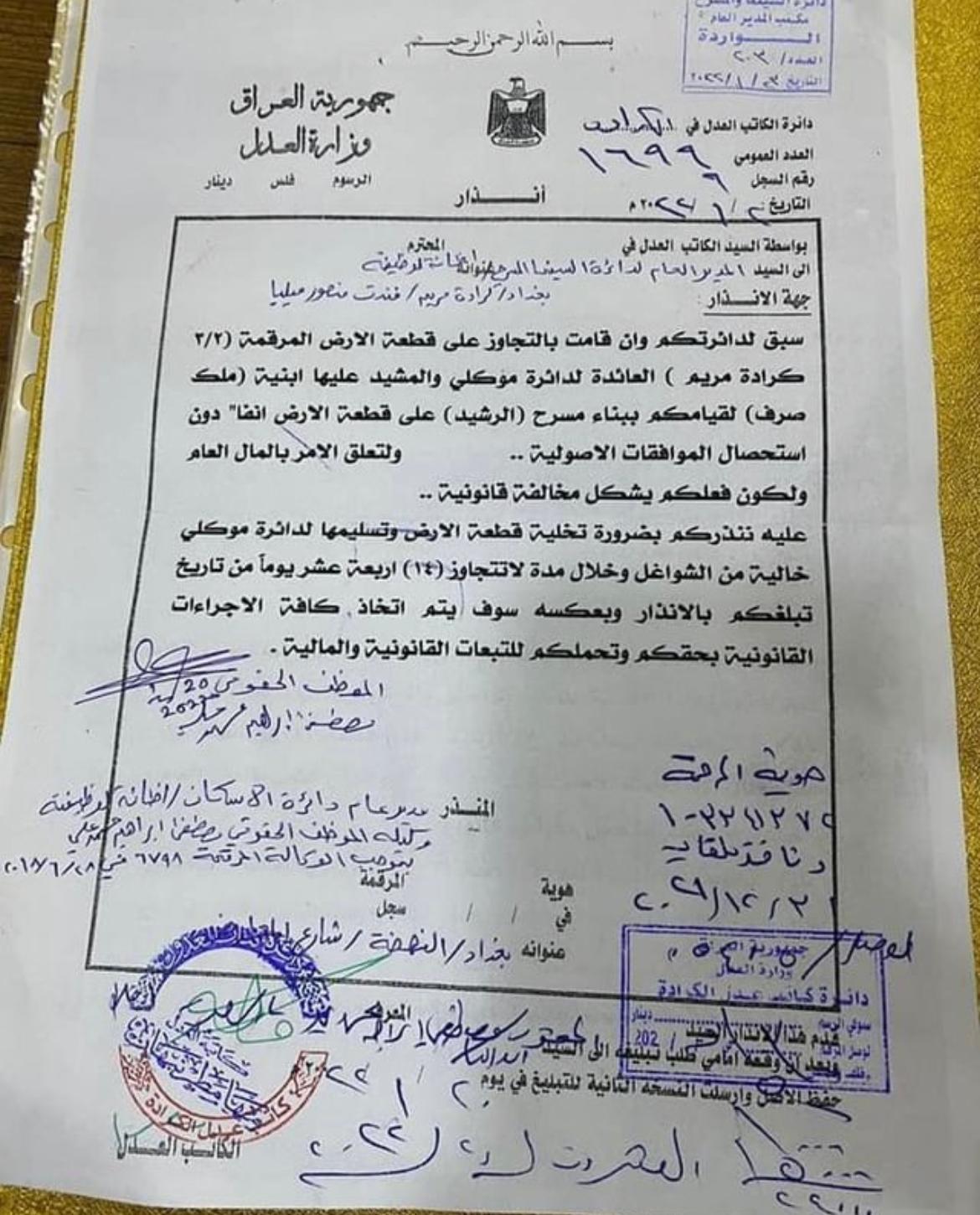 محلياتبالوثيقة.. انذار الى دائرة السينما بسبب بناء مسرح الرشيد على ارض تجاوز قبل 4 سنوات 9 مشاهدات شارك الوسومدائرة السينمامسرح الرشيدقد يهمك أيضا عربي ودولي ترامب: اذا حاولت إيران إعادة بناء قدراتها النووية فسنقضي على ذلك قبل 39 دقيقة 6 مشاهدات عربي ودولي ترامب: عملية إعادة إعمار قطاع غزة ستبدأ قريبًا قبل 43 دقيقة 6 مشاهدات سياسة مجلس النواب يقرر إجراء جولة ثانية لانتخاب النائب الثاني لرئيس البرلمان قبل ساعة واحدة 9 مشاهدات سياسة بدء عملية العدّ والفرز لانتخاب النائب الثاني رئيس مجلس النواب قبل ساعتين 7 مشاهدات سياسة انتهاء عملية التصويت لانتخاب نائب رئيس مجلس النواب قبل ساعتين 8 مشاهدات