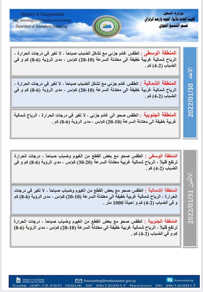 محلياتطقس العراق.. سيول يوم غد وضباب يستمر للاسبوع المقبل قبل 4 سنوات 5 مشاهدات شارك الطقسأعلنت هيئة الأنواء الجوية، الخميس، حالة الطقس في العراق للأيام المقبلة، فيما توقعت حدوث سيول يوم غد الجمعة. اقرأ ايضا الزراعة: منع استيراد الدجاج والمقطعات والمصنعات سيدخل حيز التنفيذ ابتداءً من 15 كانون الثاني العمل تعلن تحويل أكثر من 63 ألف مستفيد من الحماية الاجتماعية إلى المؤسسات الحكومية امانة بغداد تعلن ابادة أكثر من 19 ألف كلب سائب بعد وفاة شاب في بغداد.. الصحة تحذر: داء الكلب مرض فيروسي قاتل ولقاحاته متوفرة الوسومطقس العراققد يهمك أيضا عربي ودولي الولايات المتحدة تدفع 3 آلاف دولار لكل مهاجر غير شرعي مقابل مغادرة اراضيها قبل 8 ساعات 10 مشاهدات الحكم الرابع الاهلي يضرب الشرطة بقوة ويزيد من جراحاتهم آسيوياً.. قبل 8 ساعات 11 مشاهدات رياضة الشرطة يخسر أمام الأهلي السعودي بخماسية في دوري أبطال آسيا قبل 8 ساعات 35 مشاهدات سياسة الإعمار والتنمية يقدم وثيقة للإطار التنسيقي تتضمن 5 معايير لاختيار مرشح رئاسة الحكومة قبل 9 ساعات 14 مشاهدات سياسة الإطار التنسيقي يؤكد موقفه الداعم لحصر السلاح بيد الدولة قبل 9 ساعات 10 مشاهدات