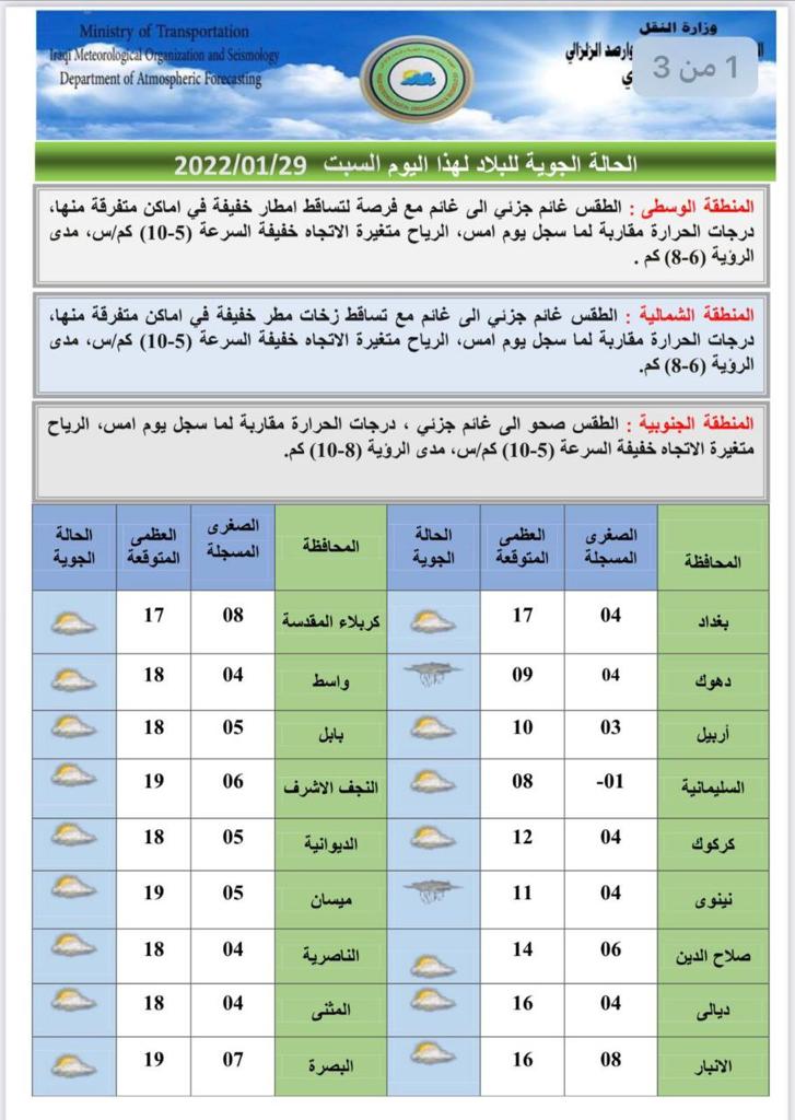 أعلنت هيئة الأنواء الجوية، السبت، عن حالة الطقس في العراق للأيام المقبلة، فيما توقعت ارتفاعاً في درجات الحرارة وامطار متفرقة.