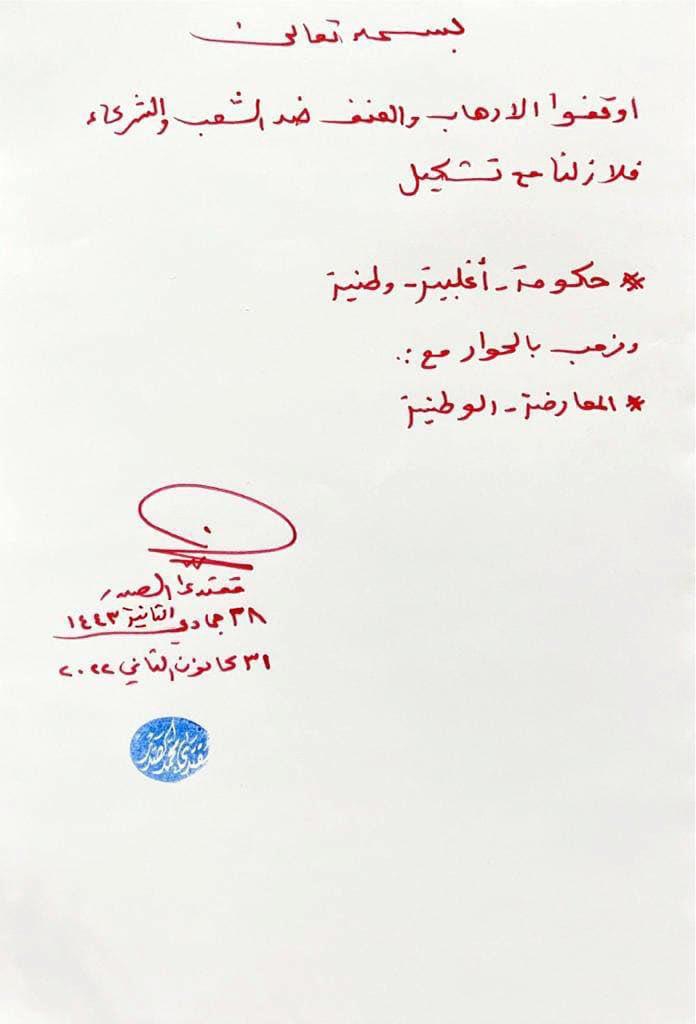 وقال الصدر، في تغريدة كتبها بخط يده وبالحبر الاحمر، تابعتها الرشيد، “أوقفوا الإرهاب والعنف ضد الشعب والشركاء فلا زلنا مع تشكيل حكومة أغلبية وطنية”.