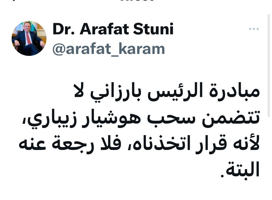 وقال كرم، في تغريدة على تويتر تابعتها الرشيد، ان “مبادرة الرئيس مسعود بارزاني لا تتضمن سحب هوشيار زيباري، لأنه قرار اتخذناه، فلا رجعة عنه البتة”.