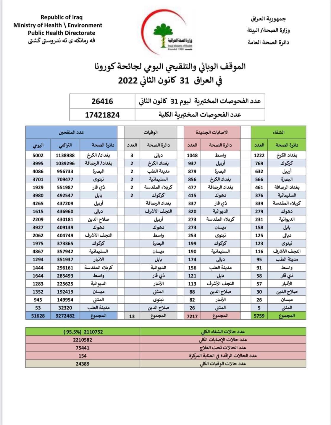 أعلنت وزارة الصحة، اليوم الاثنين، الموقف الوبائي اليومي لجائحة كورونا في عموم العراق.