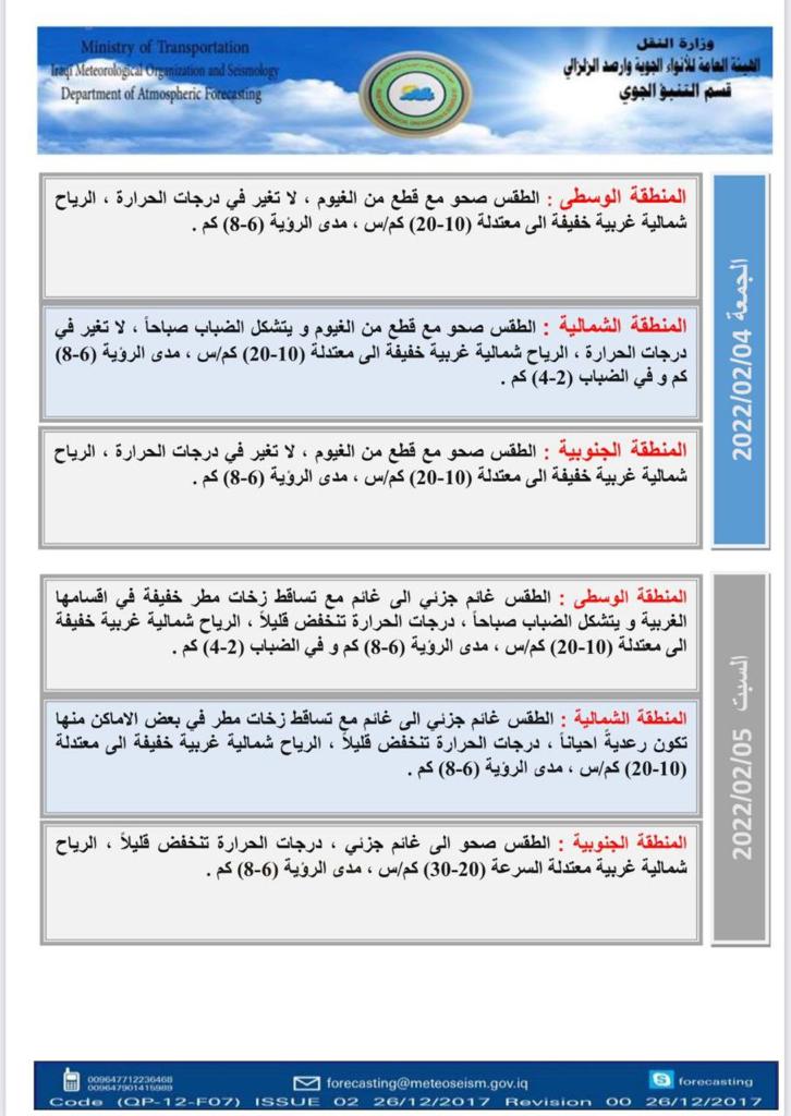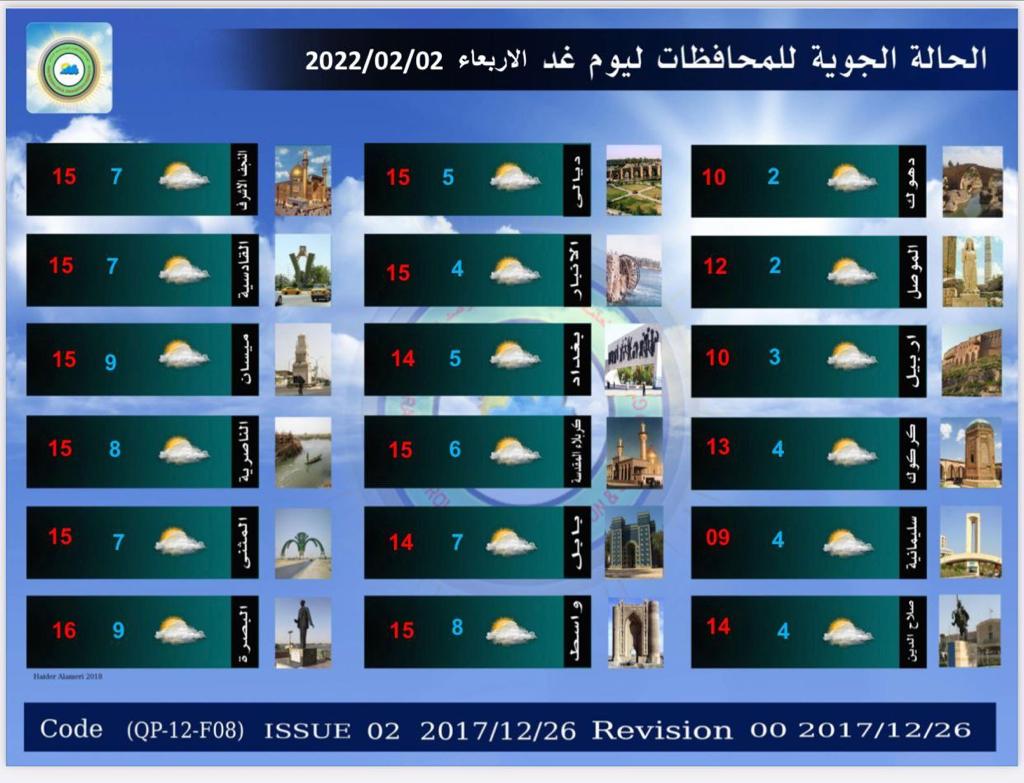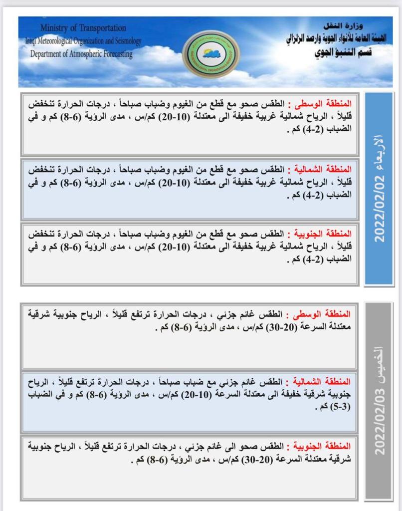 محلياتطقس العراق.. الحرارة بين ارتفاع وانخفاض وامطار متفرقة خلال الايام المقبلة قبل 4 سنوات 3 مشاهدات شارك الطقساعلنت هيئة الانواء الجوية، الثلاثاء، حالة طقس العراق خلال الايام المقبلة، فيما اشارت الى امطار متفرقة.اقرأ ايضا طقس العراق.. أمطار رعدية وانخفاض بدرجات الحرارة خلال الأيام المقبلة المفوضية: الهيئة القضائية ردت أكثر من 800 طعن بنتائج الانتخابات حتى الآن الهيئة القضائية تحسم النظر بجميع الطعون المقدمة على نتائج الانتخابات وزير العدل يوجّه بإعفاء أحد المنفّذين العدول في بغداد لابتزازه إحدى المراجعات الوسومطقس العراققد يهمك أيضا عربي ودولي الإعلام الإسرائيلي بعد مقتل أبو شباب: "حماس" اخترقت مناطق سيطرتنا قبل 14 دقيقة 4 مشاهدات عربي ودولي الولايات المتحدة تقلص مدة تصاريح عمل المهاجرين إلى 18 شهرا قبل 29 دقيقة 6 مشاهدات عربي ودولي تفاصيل جديدة.. غارة أميركية تقتل عميلا سرياً في سوريا بدل قيادي داعشي قبل 39 دقيقة 7 مشاهدات سياسة المفوضية تحدّد آلية منح مقعد المرشح المستبعد: يحل محله أعلى الخاسرين من نفس الكتلة قبل ساعة واحدة 6 مشاهدات عربي ودولي الأمم المتحدة: عودة أكثر من 378 ألف لاجئ سوري من لبنان إلى بلادهم قبل ساعة واحدة 6 مشاهدات