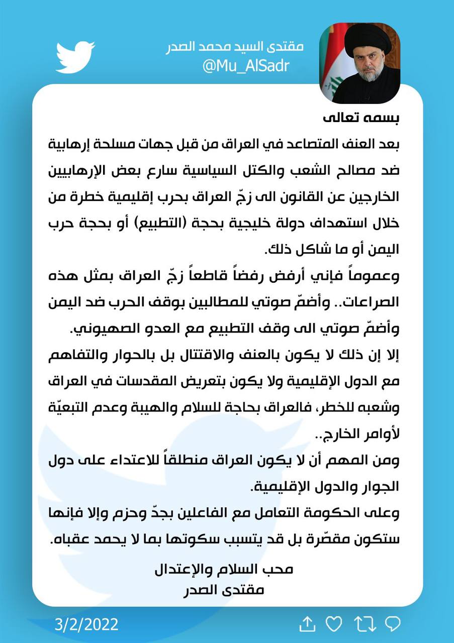 وقال السيد الصدر في تغريدة طالعتها الرشيد، انه”بعد العنف المتصاعد في العراق من قبل جهات مسلحة إرهابية ضد مصالح الشعب والكتل السياسية سارع بعض الإرهابيين الخارجين عن القانون الى زج العراق بحرب إقليمية خطرة من خلال استهداف دولة خليجية بحجة (التطبيع) أو بحجة حرب اليمن أو ما شاكل ذلك”.