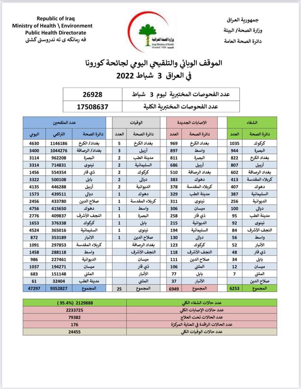 أعلنت وزارة الصحة، اليوم الخميس، الموقف الوبائي اليومي لجائحة كورونا في عموم العراق.