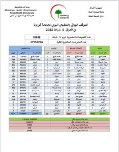أعلنت وزارة الصحة، اليوم السبت، الموقف الوبائي اليومي لجائحة كورونا في عموم العراق.