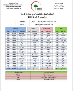 أعلنت وزارة الصحة، اليوم الاثنين، الموقف الوبائي اليومي لجائحة كورونا في عموم العراق.