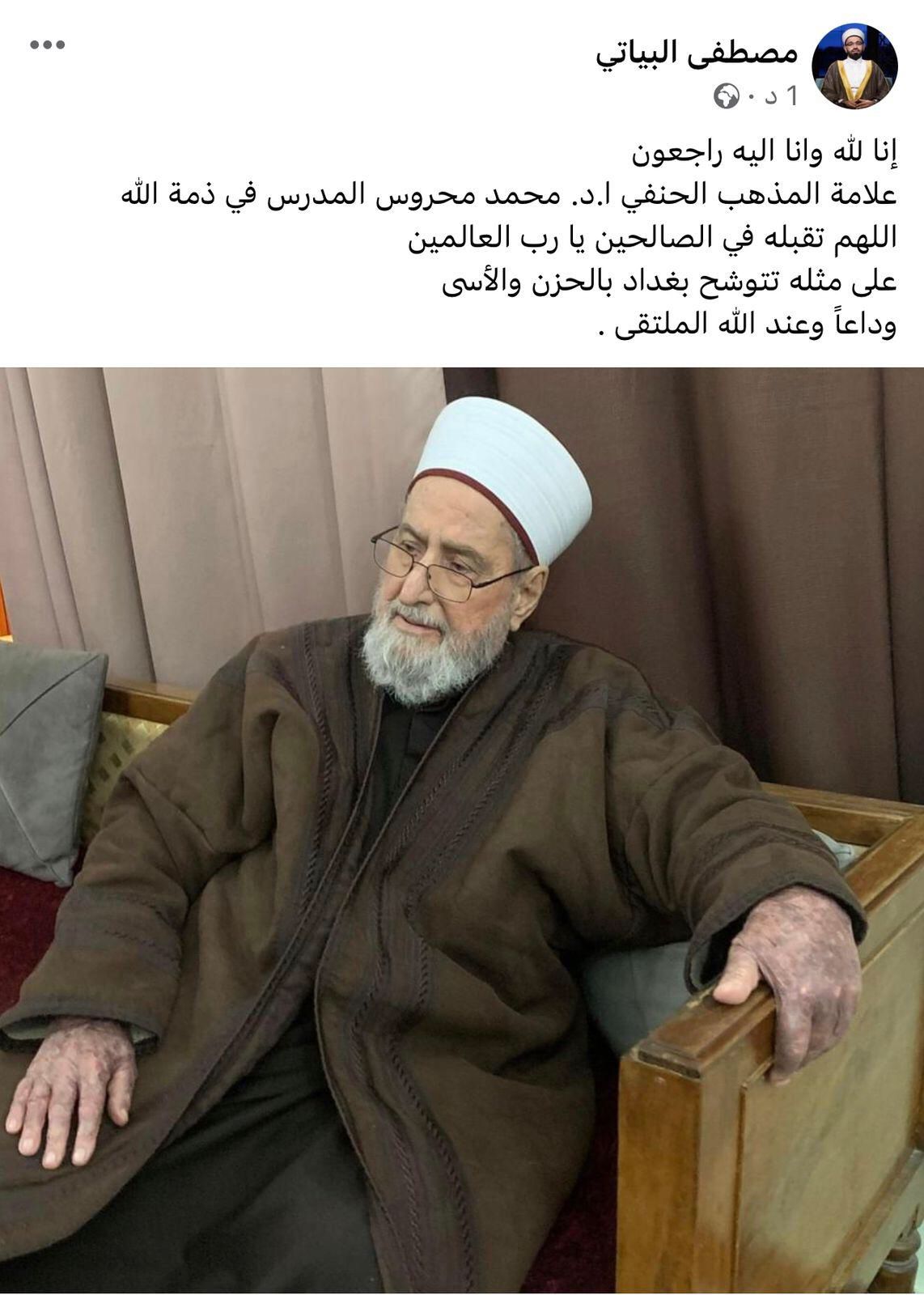 وقال المتحدث بإسم المجمع الفقهي الشيخ مصطفى البياتي، في منشور على الفيسبوك تابعته الرشيد، “علامة المذهب الحنفي أ.د محمد محروس المدرس في ذمة الله”.