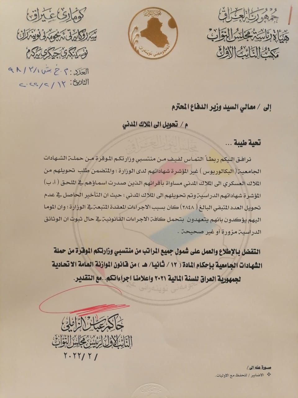 واضاف، ان الزاملي وجه كتاباً رسمياً لوزير الدفاع، للعمل على شمول جميع المراتب من منتسبي وزارة الدفاع من حملة الشهادات الجامعية والمتبقي منهم (2848) منتسب بأحكام المادة (12/ ثانيا/ هـ) من قانون الموازنة العامة الاتحادية لجمهورية العراق للسنة المالية 2021 مساواة بأقرانهم السابقين”.