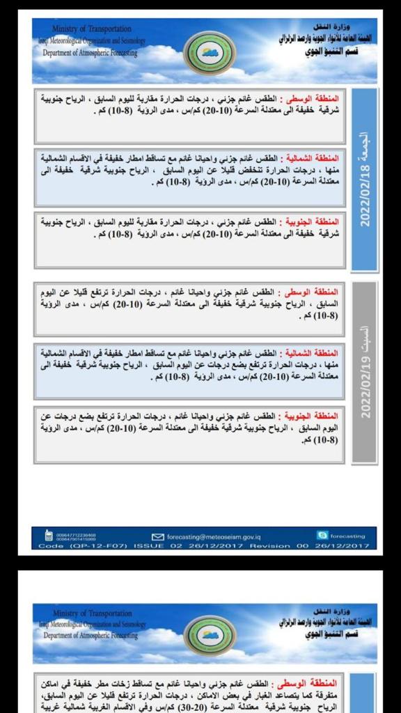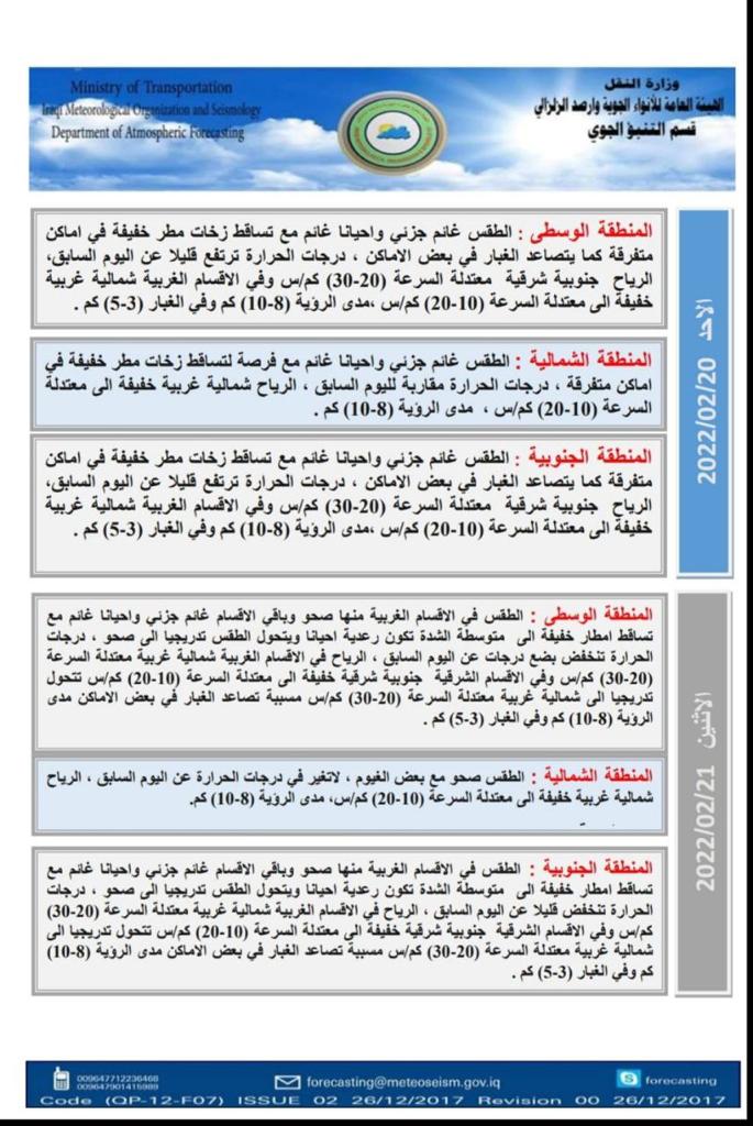 محلياتطقس العراق.. تساقط امطار وتصاعد للغبار خلال الايام المقبلة قبل 4 سنوات 8 مشاهدات شارك الطقسأعلنت هيئة الأنواء الجوية، الخميس، حالة الطقس في العراق للأيام المقبلة، فيما توقعت تساقط أمطار وتصاعد للغبار.اقرأ ايضا مؤسسة الشهداء: لا قرار بقطع رواتب ذوي الشهداء قبل 25 كانون الثاني طقس العراق.. أمطار خفيفة وانخفاض بدرجات الحرارة خلال الأيام المقبلة الزراعة: منع استيراد الدجاج والمقطعات والمصنعات سيدخل حيز التنفيذ ابتداءً من 15 كانون الثاني العمل تعلن تحويل أكثر من 63 ألف مستفيد من الحماية الاجتماعية إلى المؤسسات الحكومية الوسومطقس العراققد يهمك أيضا محليات مؤسسة الشهداء: لا قرار بقطع رواتب ذوي الشهداء قبل 25 كانون الثاني قبل 21 دقيقة 3 مشاهدات أقتصاد الذهب يسجل مستوى قياسياً جديداً مع تصاعد التوتر بين أميركا وفنزويلا قبل 33 دقيقة 8 مشاهدات عربي ودولي ترامب: ناقلات النفط المصادرة من فنزويلا ستبقى تحت سيطرتنا قبل ساعة واحدة 6 مشاهدات محليات طقس العراق.. أمطار خفيفة وانخفاض بدرجات الحرارة خلال الأيام المقبلة قبل ساعتين 12 مشاهدات أقتصاد النفط يتراجع مع ترقب خطوة أميركية بشأن خام فنزويل قبل ساعتين 8 مشاهدات