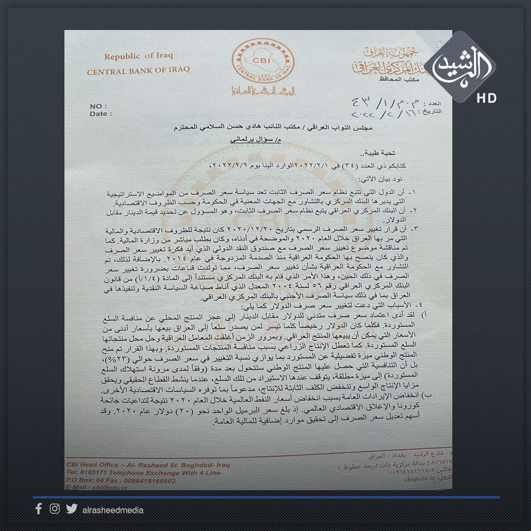 رد البنك المركزي العراقي، على سؤال برلماني بشأن سعر صرف الدولار.