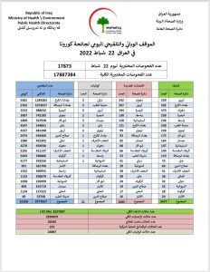 أعلنت وزارة الصحة، اليوم الثلاثاء، الموقف الوبائي اليومي لجائحة كورونا في عموم العراق.