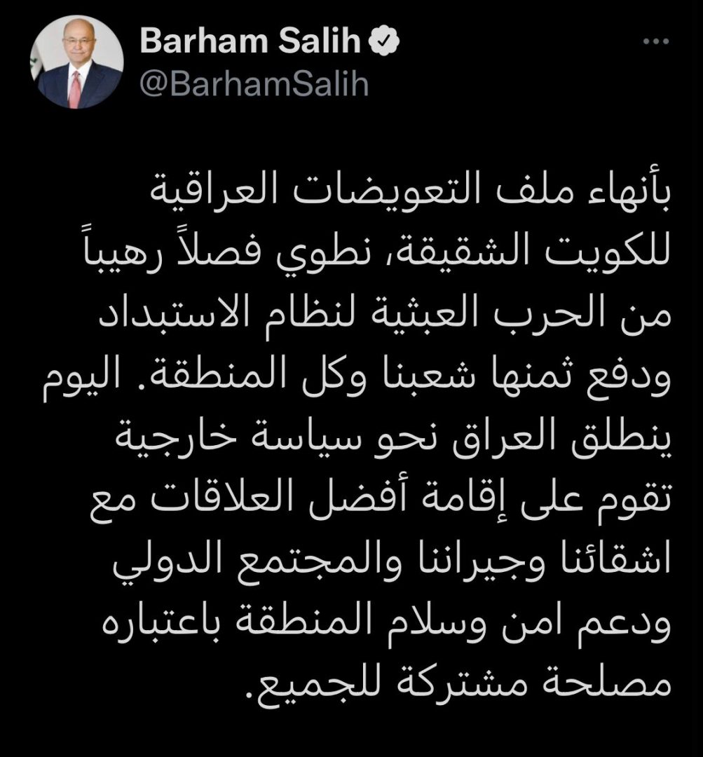 سياسةرئيس الجمهورية: بإنهاء ملف التعويضات نطوي فصلاً رهيباً من الحرب العبثية قبل 4 سنوات 7 مشاهدات شارك الوسومملف تعويضات الكويتقد يهمك أيضا عربي ودولي هجوم مسلح يستهدف عناصر من "الدفاع السورية" غربي حلب قبل دقيقتان 2 مشاهدات أقتصاد وكالة "فيتش" تثبت تصنيف العراق الائتماني عند (B-) مع نظرة مستقبلية "مستقرة" قبل 13 دقيقة 3 مشاهدات عربي ودولي أستراليا: لا نقبل الربط بين الدولة الفلسطينية وهجوم سيدني قبل 16 دقيقة 4 مشاهدات محليات التجارة تطلق خدمة رفع الحجب إلكترونياً لذوي الاحتياجات الخاصة في عدد من المحافظات قبل 51 دقيقة 8 مشاهدات أمن الداخلية تنفي إحالة مشروع دمج البطاقة الوطنية مع بطاقة السكن إلى شركة سورية قبل 53 دقيقة 7 مشاهدات