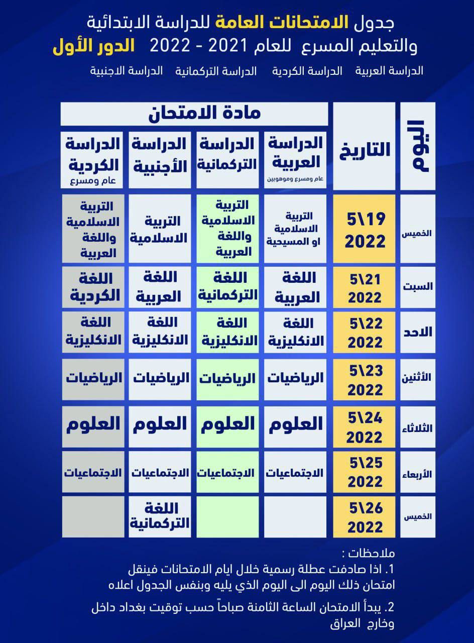 اعلنت وزارة التربية، اليوم الخميس، جدول الامتحانات العامة (الوزاري) للدراسة الابتدائية للعام الدراسي 2021 – 2022 “الدور الأول.