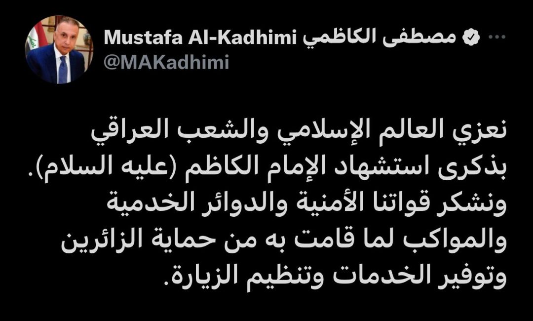 نعزي العالم الإسلامي والشعب العراقي بذكرى استشهاد الإمام الكاظم (عليه السلام). ونشكر قواتنا الأمنية والدوائر الخدمية والمواكب لما قامت به من حماية الزائرين وتوفير الخدمات وتنظيم الزيارة.