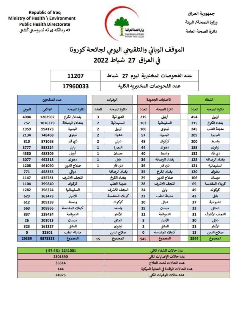 أعلنت وزارة الصحة، اليوم الاحد، الموقف الوبائي اليومي لجائحة كورونا في عموم العراق.