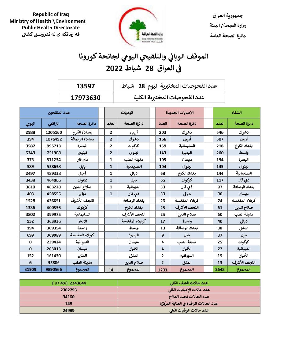 أعلنت وزارة الصحة، اليوم الاثنين، الموقف الوبائي اليومي لجائحة كورونا في عموم العراق.