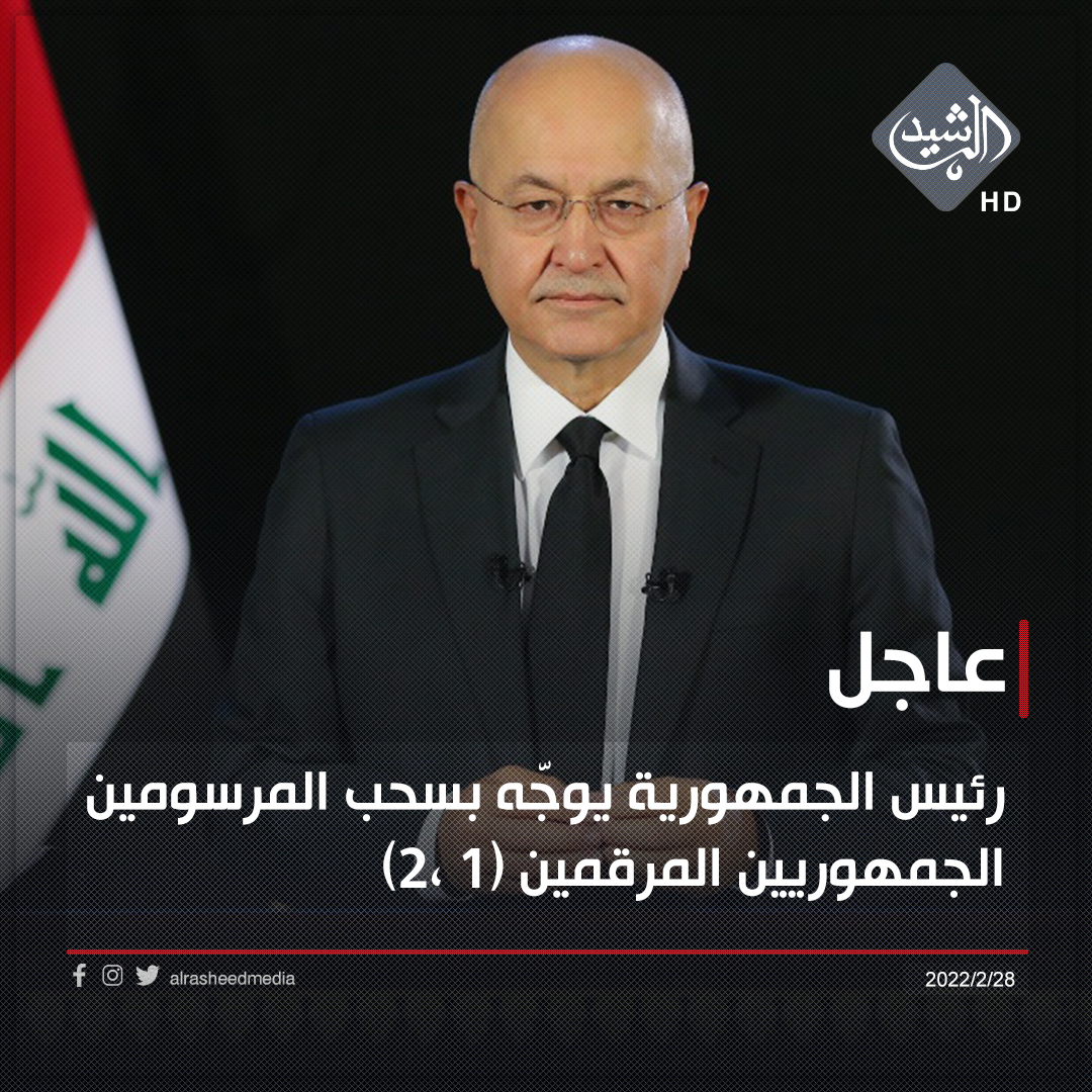 وجه رئيس الجمهورية برهم صالح، اليوم الاثنين، بسحب المرسومين الجمهوريين المرقمين (١ ،2)، فيما وجه بالإيعاز للجهات القضائية باتخاذ الإجراءات اللازمة بعد سحب المرسومين.