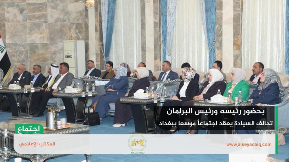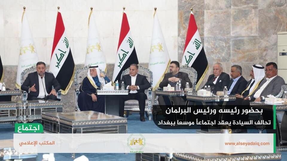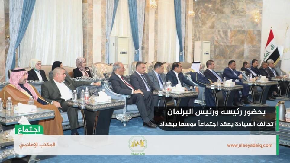 وذكر المكتب الاعلامي للتحالف، في بيان تلقته الرشيد، انه “حرصاً على تصحيح مسار العملية السياسية في العراق والخروج بنتائج تضمن تشكيل حكومة قوية قادرة على إدارة البلاد وتجاوز كل العقبات؛ عقد تحالف السيادة بحضور رئيسه خميس الخنجر ورئيس مجلس النواب محمد الحلبوسي، اجتماعاً موسعاً في مقر التحالف بالعاصمة بغداد”.