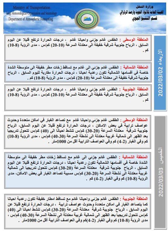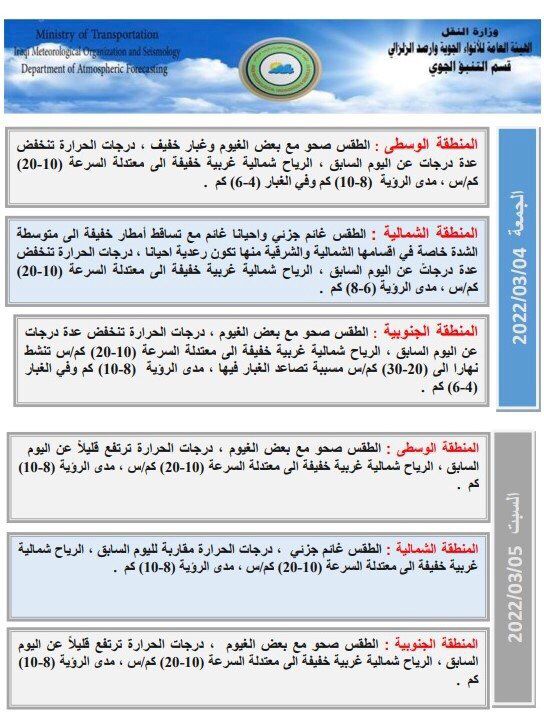 أعلنت هيئة الأنواء الجوية، اليوم الثلاثاء، عن حالة الطقس في البلاد للأيام المقبلة، فيما توقعت تصاعداً للغبار وحدوث عواصف ترابية الخميس المقبل.