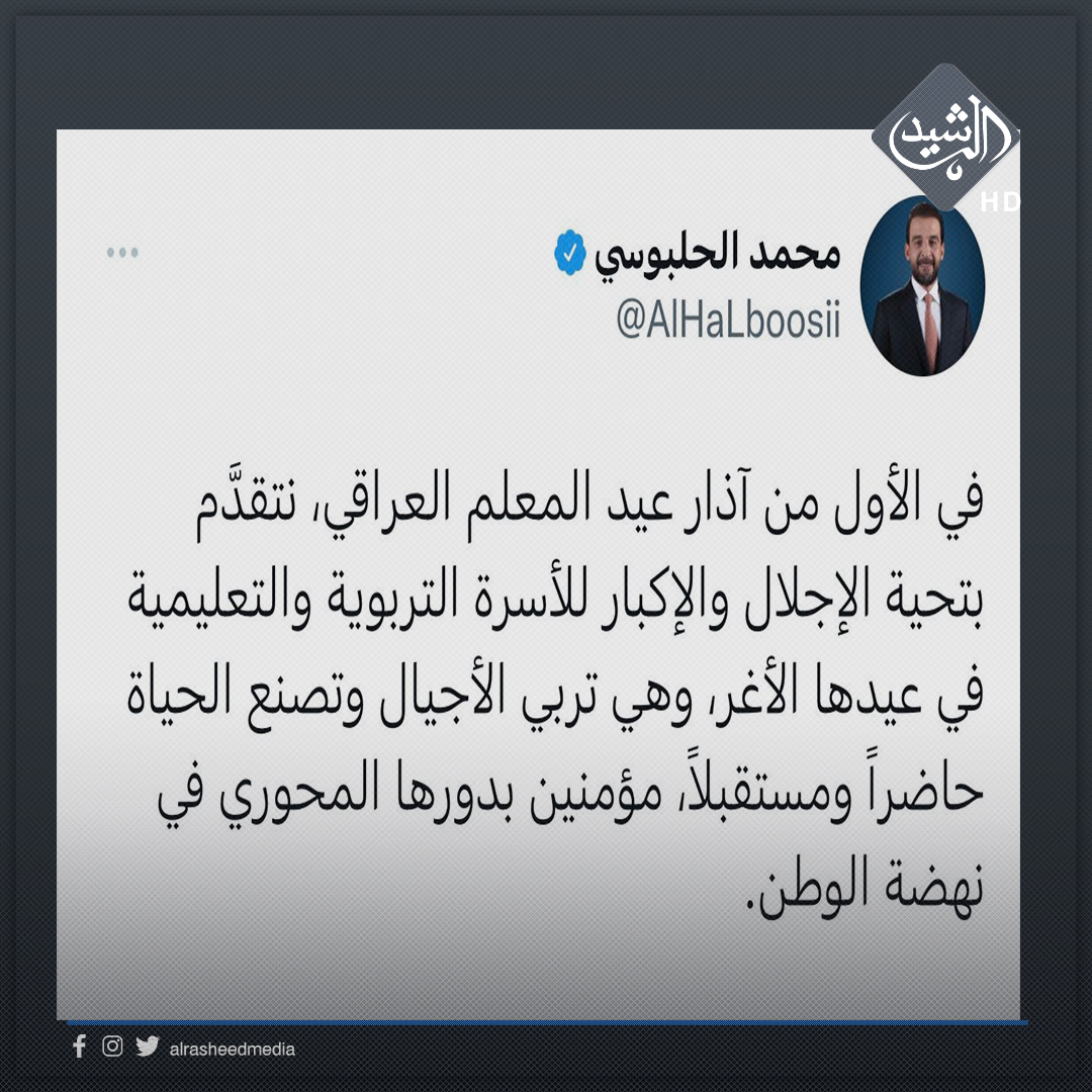 وقال الحلبوسي، بتغريدة على تويتر تابعتها الرشيد، “في الأول من آذار عيد المعلم العراقي، نتقدَّم بتحية الإجلال والإكبار للأسرة التربوية والتعليمية في عيدها الأغر، وهي تربي الأجيال وتصنع الحياة حاضراً ومستقبلاً، مؤمنين بدورها المحوري في نهضة الوطن”.