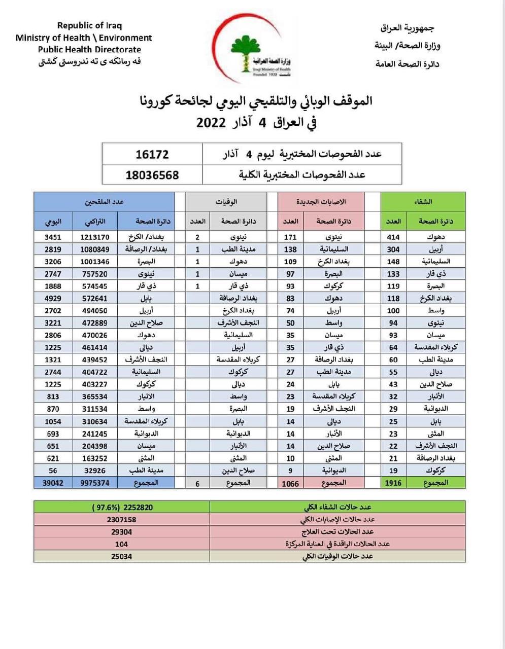 اعلنت وزارة الصحة، الموقف الوبائي لفيروس كورونا في عموم العراق.